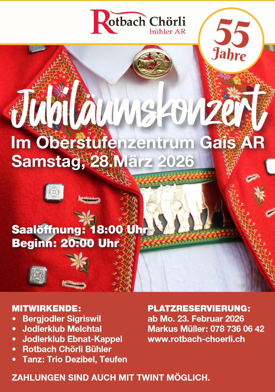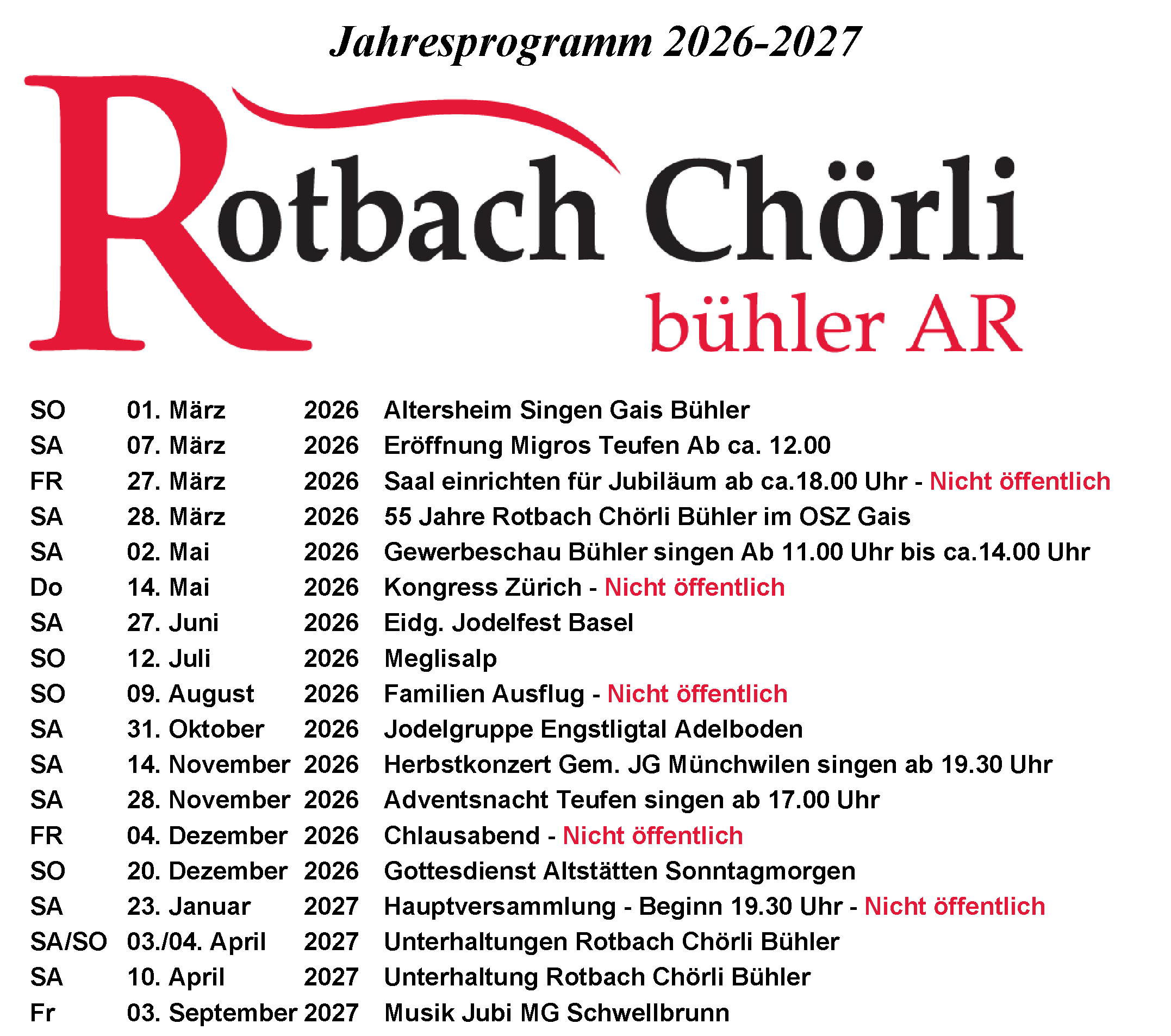 Rotbach-Choerli-2024Rotbachchoerli-2019-01Rotbachchoerli-2019-02Rotbachchörli-2016-002image1Rotbachchoerli-2018-01image2Rotbachchoerli-2018-02 Aktuell JubiKonzert-FlyerJahresprogramm-2026-2027CD-Cover-2017-01-2Chörli-Altersheim-2019 De Grossvater het gsät Fotos zum Jubiläum 51 Jahre Rotbach-Chörli Bühler Agenda Mai 2 Ganztägig Gewerbeschau Bühler singen Ab 11.00 Uhr bis ca.14.00 Uhr Mai 14 Ganztägig Kongress Zürich – Nicht öffentlich Juni 27 Ganztägig Eidg. Jodelfest Basel Juli 12 Ganztägig Meglisalp Aug. 9 Ganztägig Familien Ausflug – Nicht öffentlich Kalender anzeigen Links Jodlerklub BumbachSchötze Chörli, SteinBergwald Chörli, EnggenhüttenJodelclub Alpeblueme, HerisauJodelclub Bergfinkli, GrabsAlpstein Quartett Archiv April 2022 März 2022 März 2019 August 2017